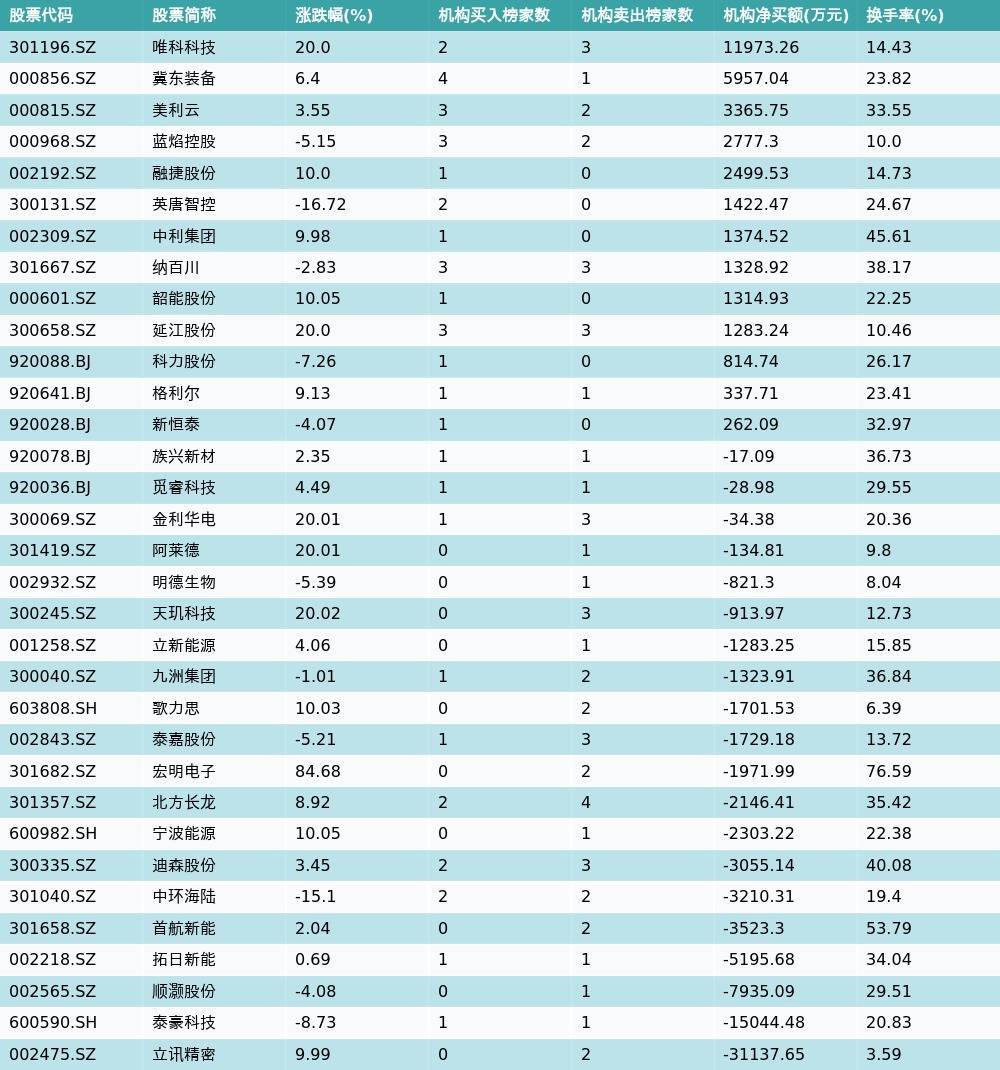 南财智讯3月25日电,盘后数据显示,因当日异动登上龙虎榜的个股中,33只沪深A股龙虎榜出现了机构的身影,机构合计净卖出48800.17万元,具体来看,机构净买入13只个股,净卖出20只个股。其中,机构净买入前三分别为唯科科技(301196.SZ)、冀东装备(000856.SZ)与美利云(000815.SZ),详情见下图:机构净卖出的个股中,前三分别为立讯精密(002475.SZ)、泰豪科技(600590.SH)与顺灏股份(002565.SZ)。