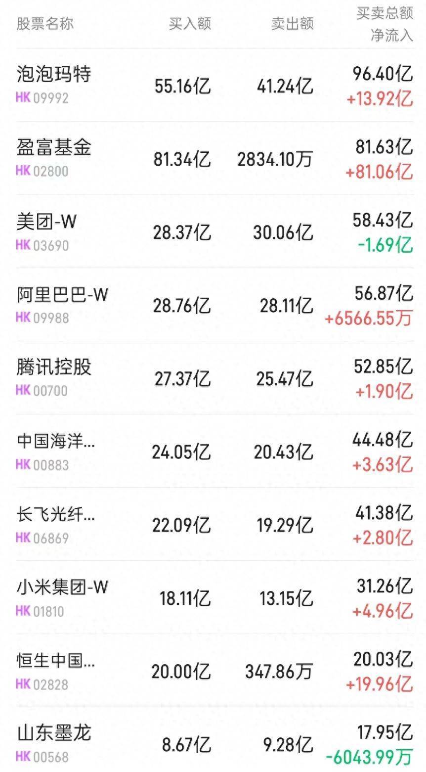 北水净买入最多的个股是盈富基金(02800)、恒生中国企业(02828)、泡泡玛特(09992)。北水净卖出最多的个股是中海油(00883)、腾讯(00700)、山东墨龙(00568)。