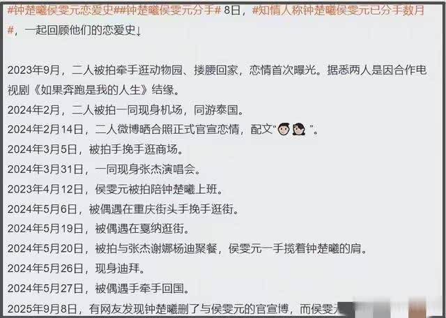 钟楚曦和侯雯元是2023年拍戏认识的,2024年2月高调官宣。结果2025年9月,她悄悄删了那条微博,只删这一条,别的恋爱向内容都在。侯雯元那边啥也没动,既没点赞,也没评论,更没发声明,就像没看见一样。
